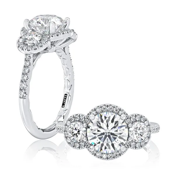 Three Stone Round Center Diamond Engagment Ring with Round Diamond Halos Image 2 Quest Fine Jewelers Fairfax, VA