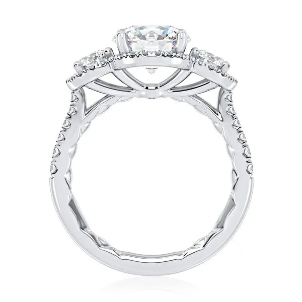 Three Stone Round Center Diamond Engagment Ring with Round Diamond Halos Image 3 Quest Fine Jewelers Fairfax, VA